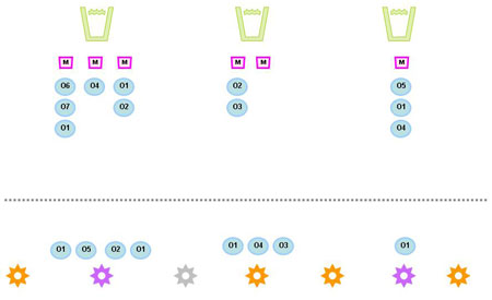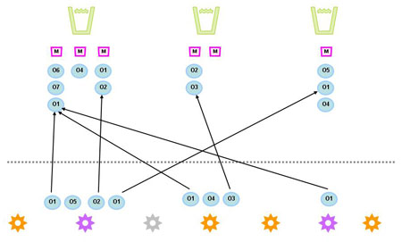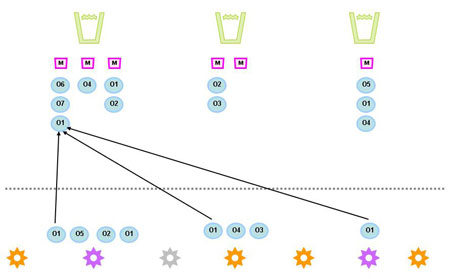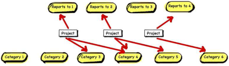 For example, in this diagram Outputs 1 (O1) is being delivered by 3 different projects. Each project is then linked to the Milestone so that at reporting time the actuals from each project are added up against the linked Output.